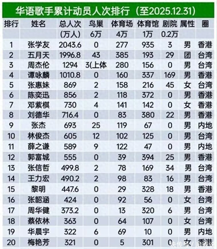 近期持续为大家带来各类榜单盘点,这一次,我们聚焦于华语乐坛歌手生涯累计动员观众人次的统计排行。